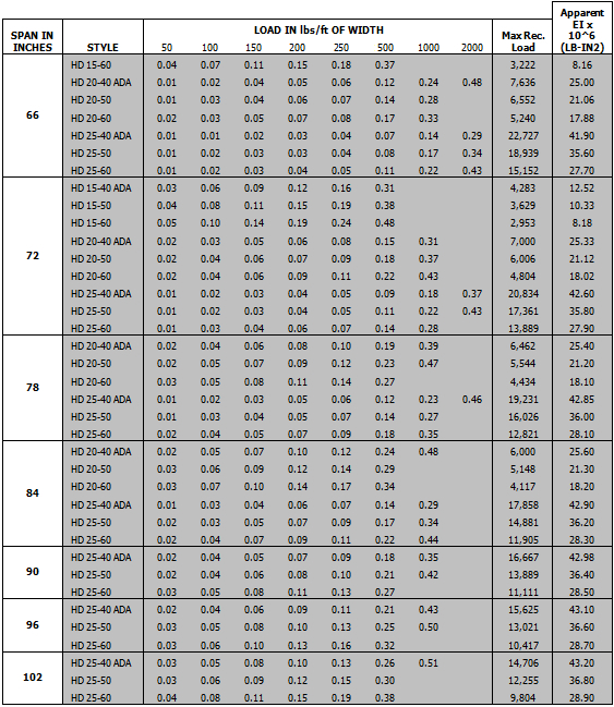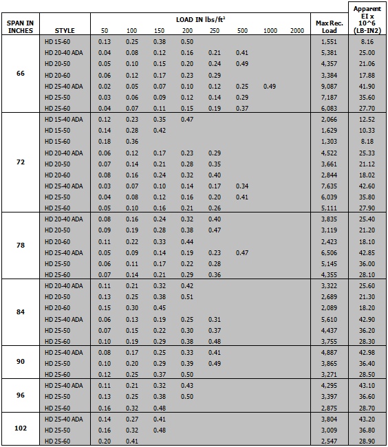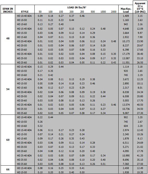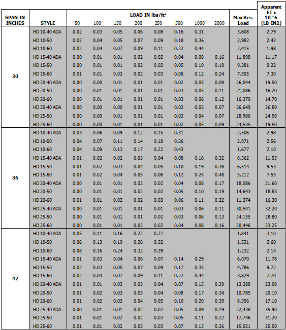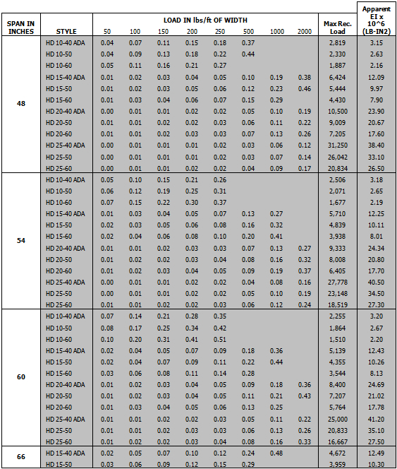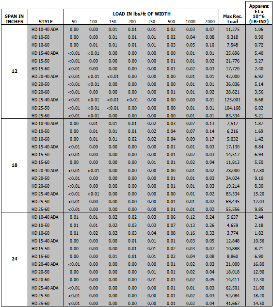 Pultruded Heavy Duty Fiberglass Grating Uniform Load Deflection Table: